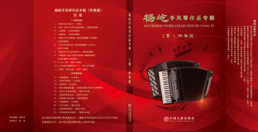 在纪念建党100周年到来的前夕,**手风琴演奏家、国家一级演员杨屹,根据多年参加国家和军队大型活动所创编演奏的经典曲目之积累而分类整理的《杨屹手风琴作品专辑》和《杨屹手风琴协作艺术CD/DVD专辑》,已由***出版机构<中国文联出版社>和<中国文联音像出版公司>同步出版发行。这是手风琴人在重要历史节点上再次与时俱进的为祖国欢歌、为时代歌唱的又一生动礼赞!